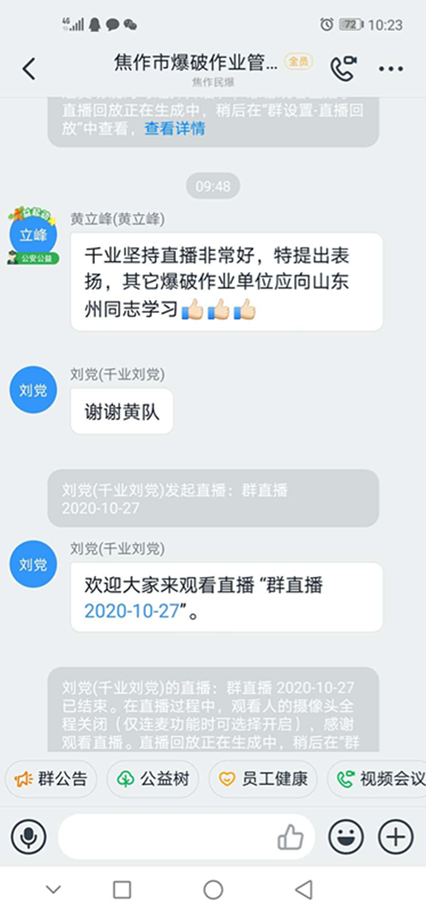 近日,焦作市公安局支队领导按照河南省厅民爆未端管控全视频要求,建立了覆盖全市可视频的钉钉群,组织了焦作市辖区爆破作业人员本群,对爆破作业进行全程跟踪管理。马村分公司积极响应南省民爆末端管控全视频要求,组织爆破作业相关人员进入“焦作市爆破作业管控群”,利用将爆破现场进行直播,主要直播人员到位情况(三大员及工程技术人员是否到位)、卸车、电子雷管入库、装填、起爆等视频。 在爆破作业中,首先,现场人员全部到位,包括爆破工程技术人员1名,爆破员2名,安全员1名,保管员2名,持各自人员名片进行报到。  当运输岩石粉状大包和电子雷管的车到达作业地点后,对数量进行清点,卸车。直播开始。  下图为将电子雷管进行入库。  下图为爆破员进行装填直播。 最后,起爆直播。 马村分公司经过三天钉钉视频直播的摸索与实践,逐步建立起完整可行的直播过程,且受到市局相关领导的口头表扬。马村分公司将会一直严格按照焦作市局要求,利用钉钉直播,实现民爆末端管控全视频要求。 |