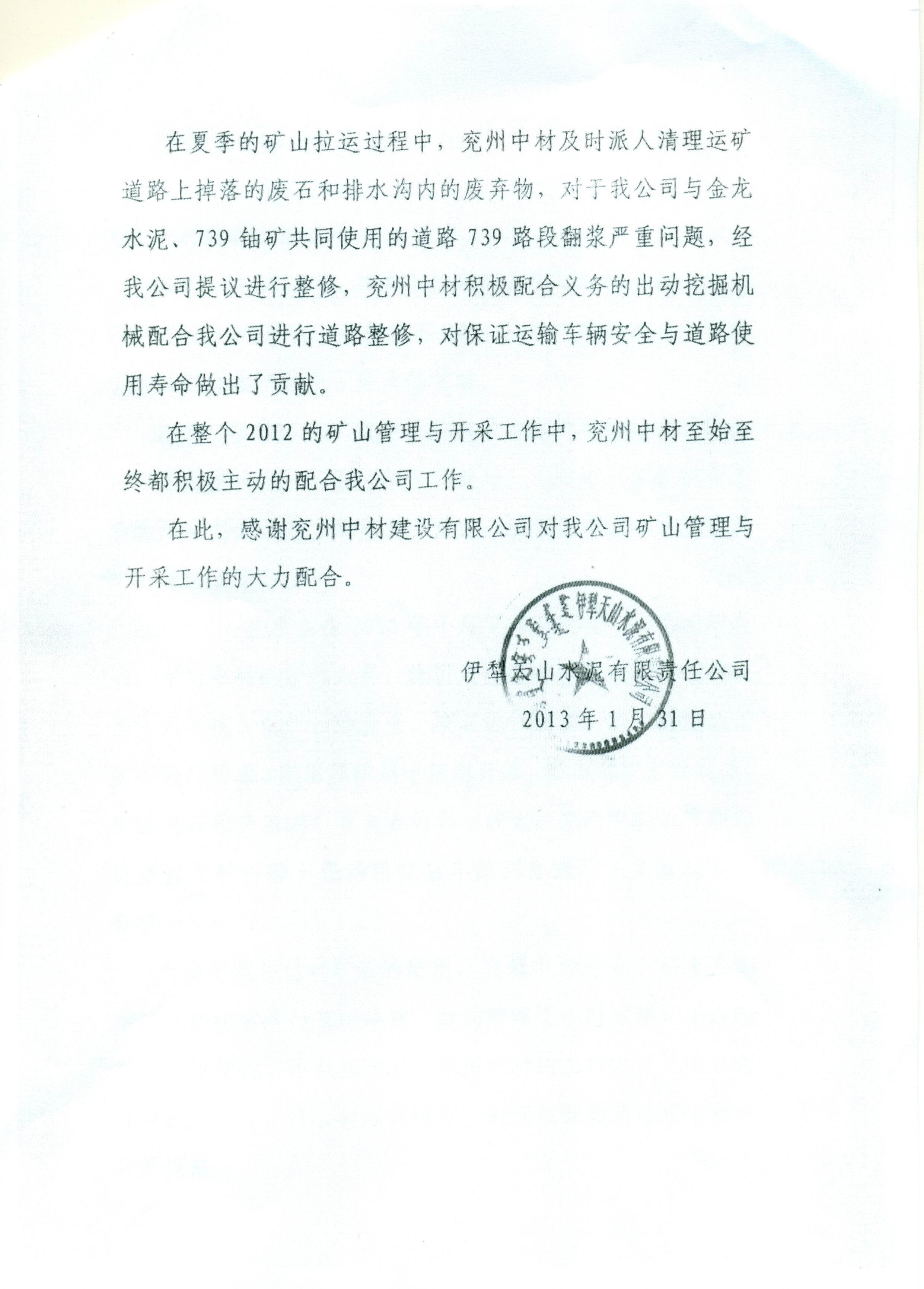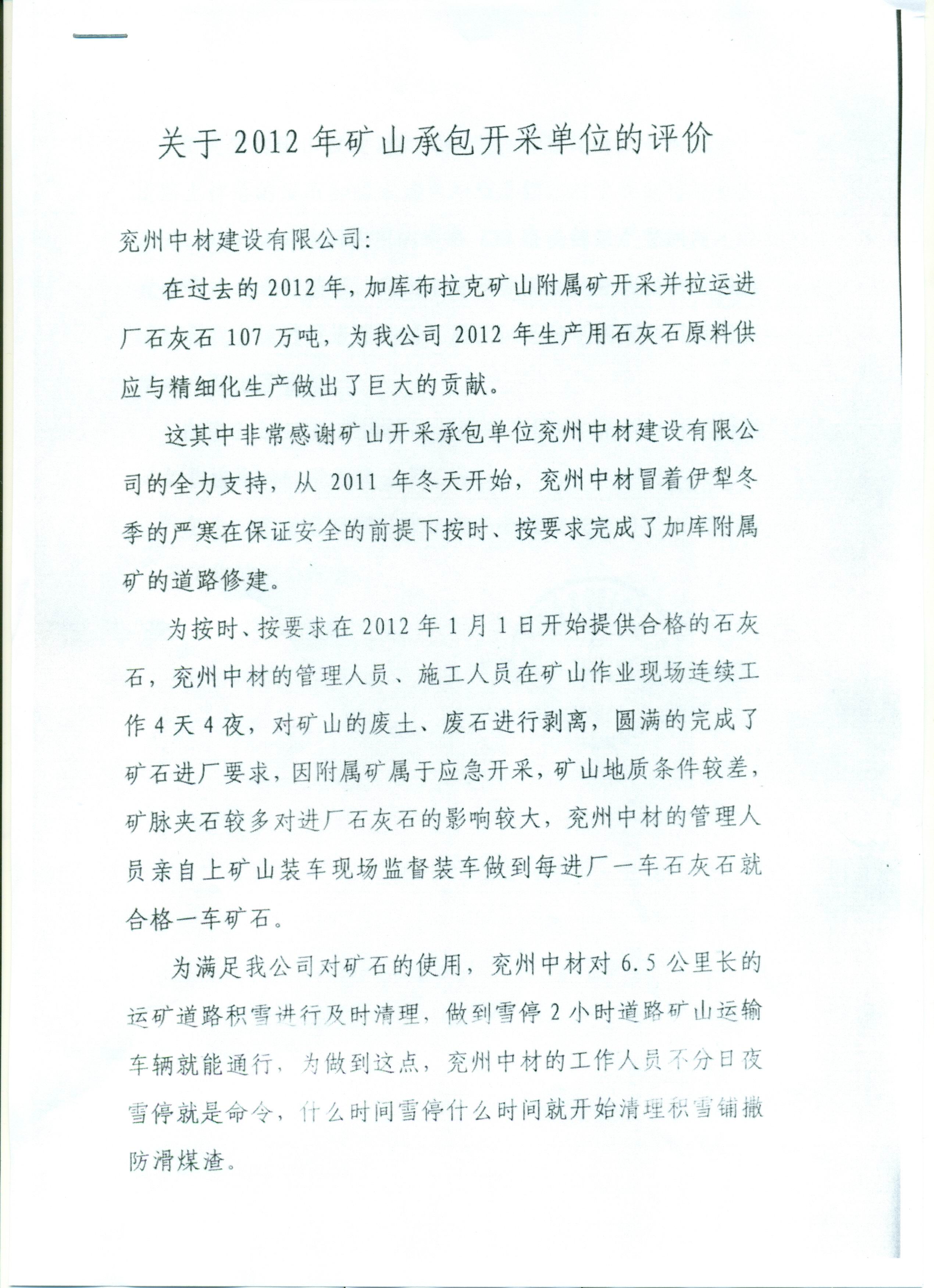 伊犁天山水泥有限责任公司对2012年矿山开采承包单位的评价